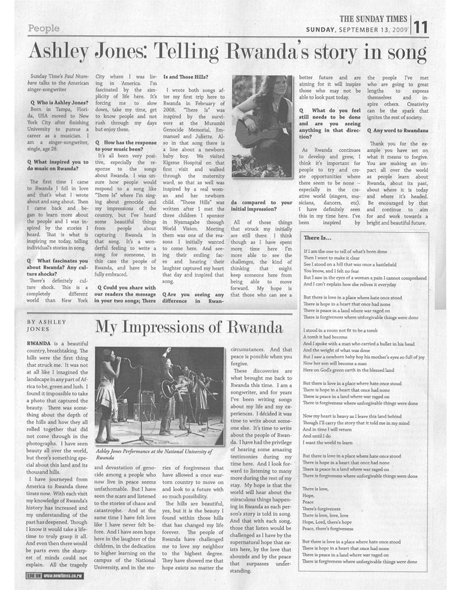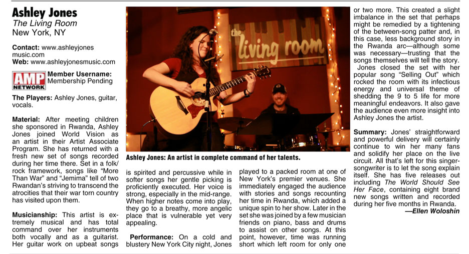 "On a cold and blustery New York City night, Jones played to a packed room at one of New York's premier venues. She immediately engaged the audience with stories and songs recounting her time in Rwanda, which added a unique spin to her show... Jones' straightforward and powerful delivery will certainly continue to win her many fans and solidify her place in the live circuit."
